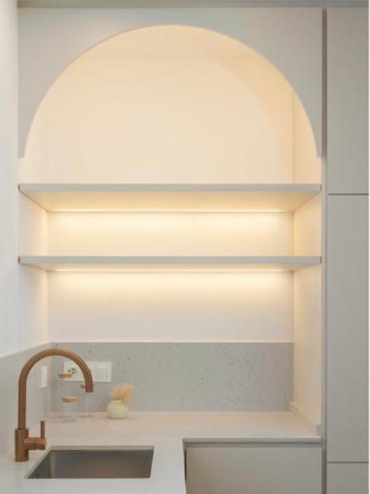 تتميز منطقة المعيشة بإضاءة مميزة. وتضم غرفة معيشة/طعام خارجية مع شرفة جولييت، مما يعزز أناقتها. يندمج المطبخ المفتوح بشكل مثالي مع المساحة، ويتميز بجزيرة مركزية عملية ونوافذ كبيرة مطلة على الخارج، مما يجعله نقطة محورية عملية واجتماعية.