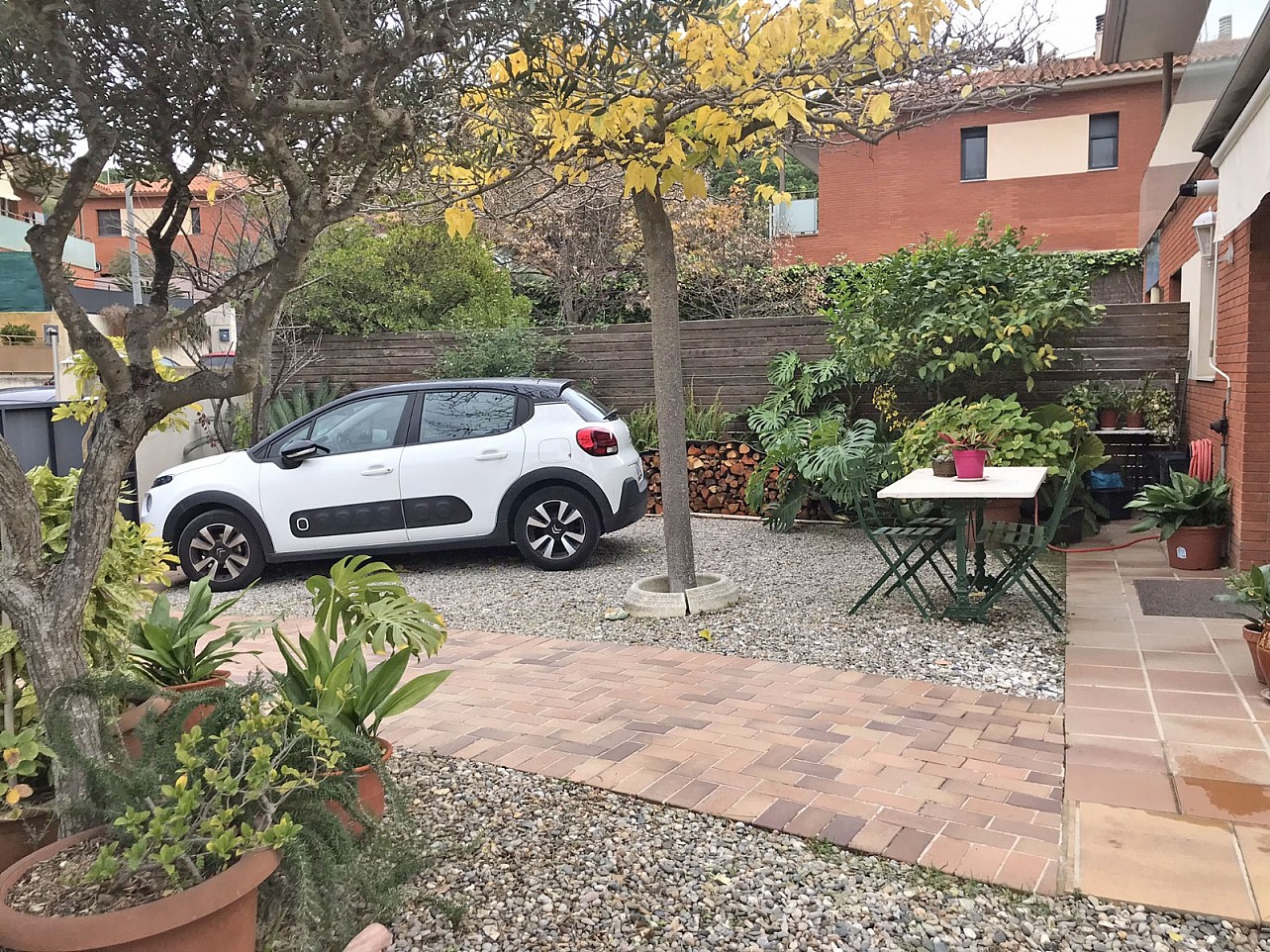- Junto a la casa, hay un pequeño conjunto de mesa y sillas de jardín de metal verde oscuro, ideal para comidas o cafés al aire libre.