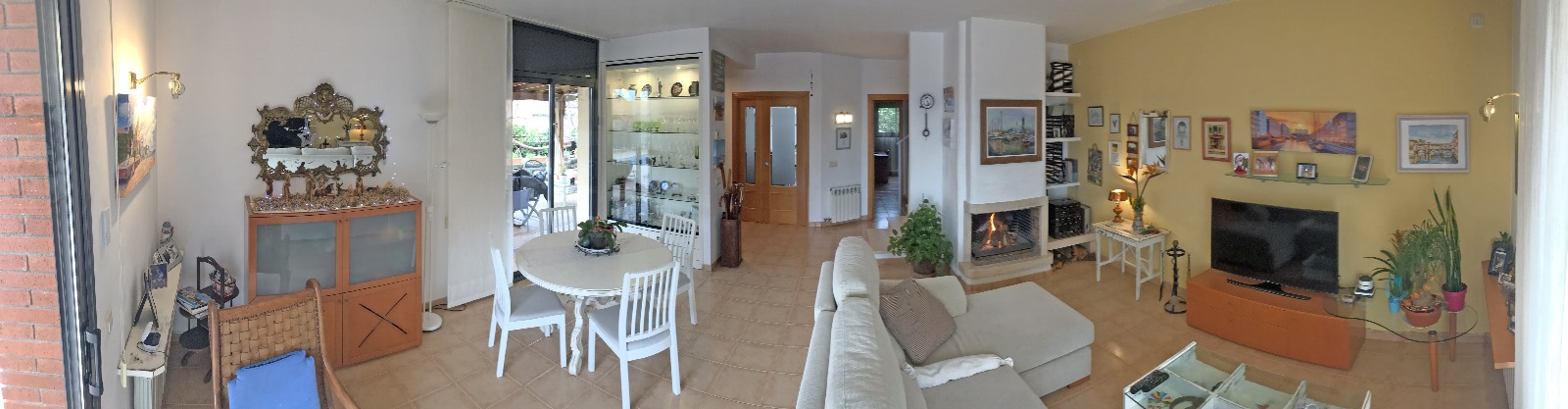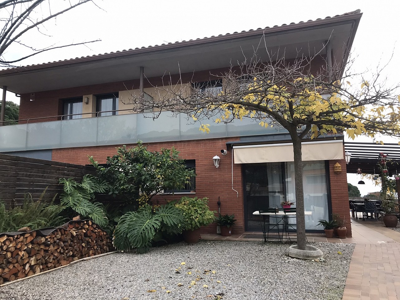 - El primer piso (o planta baja) tiene amplias puertas correderas de cristal que dan acceso directo a la terraza y la piscina, permitiendo mucha luz natural. Hay un toldo claro que se extiende sobre una de las puertas para proporcionar sombra.