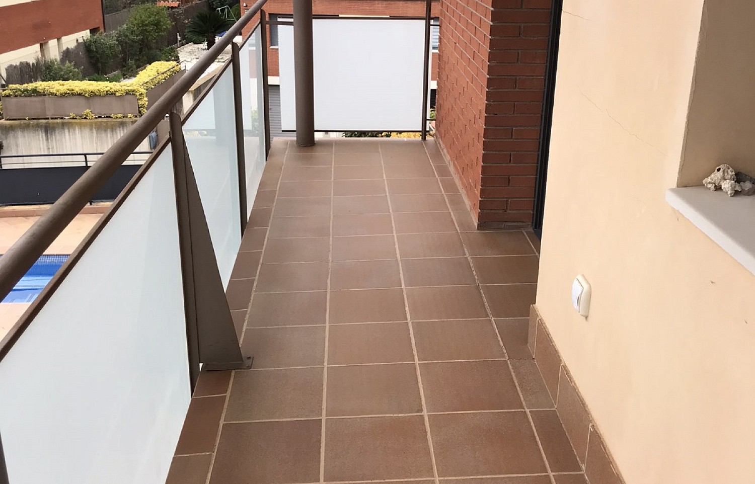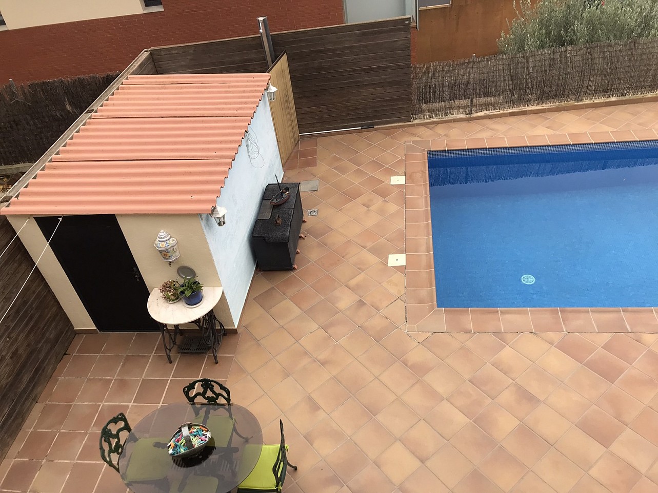 - Terraza: Toda la zona alrededor de la piscina está pavimentada con baldosas de terracota o color marrón claro, creando un espacio amplio y limpio.