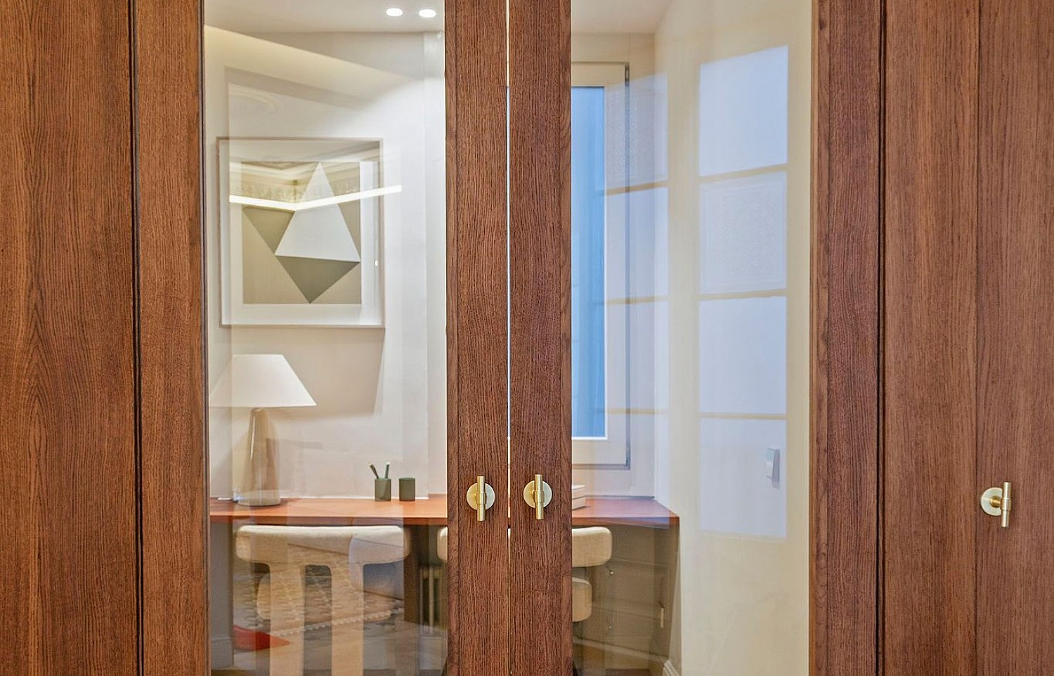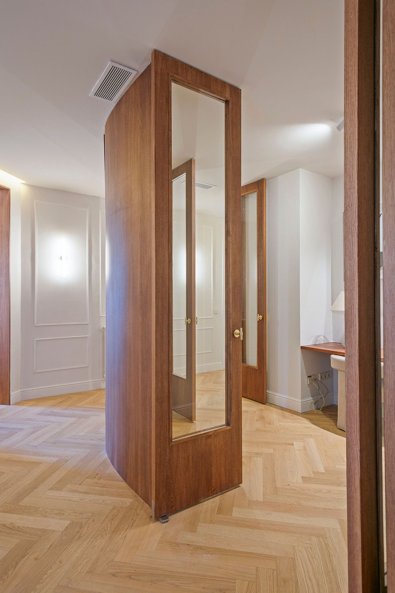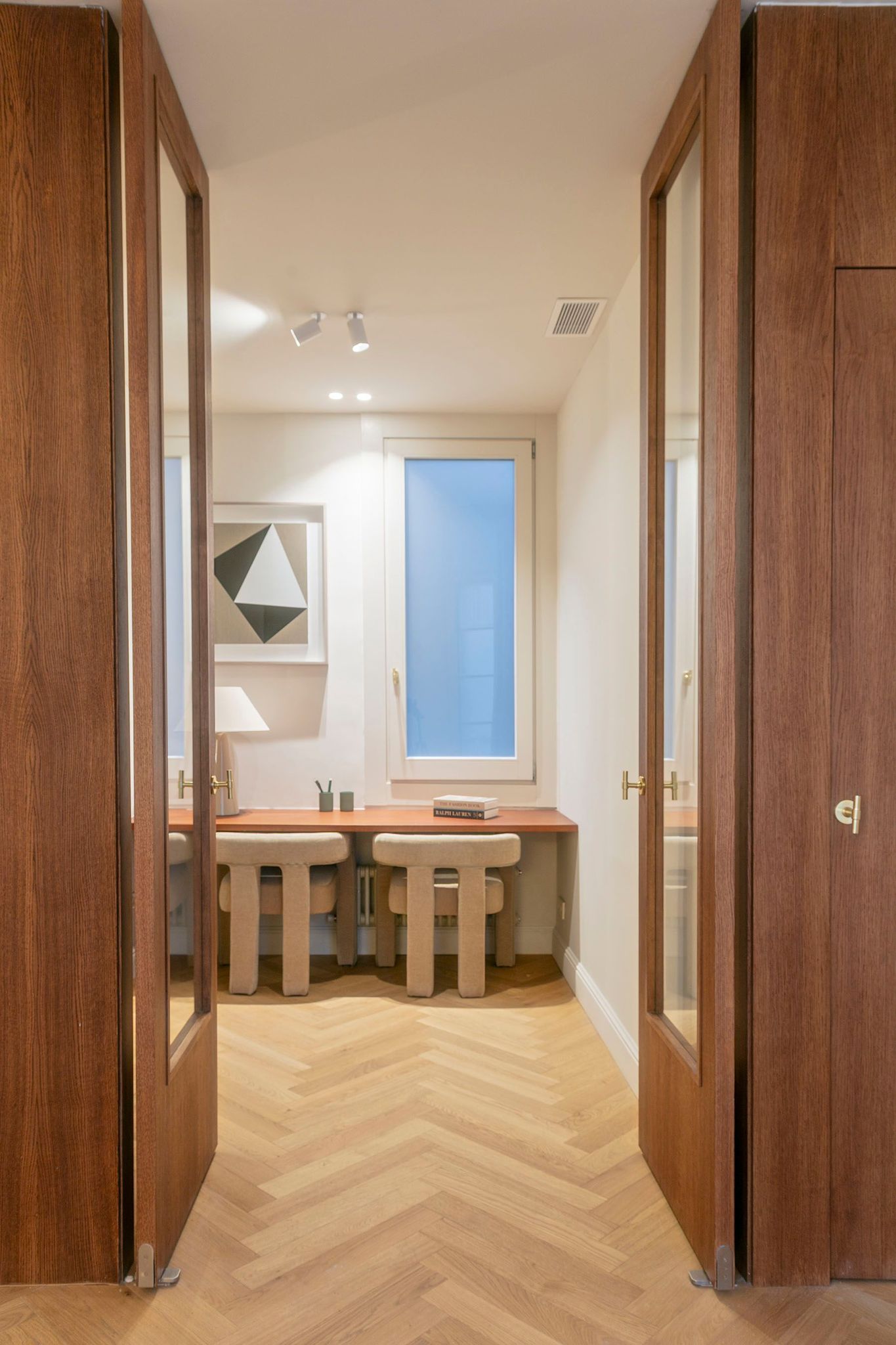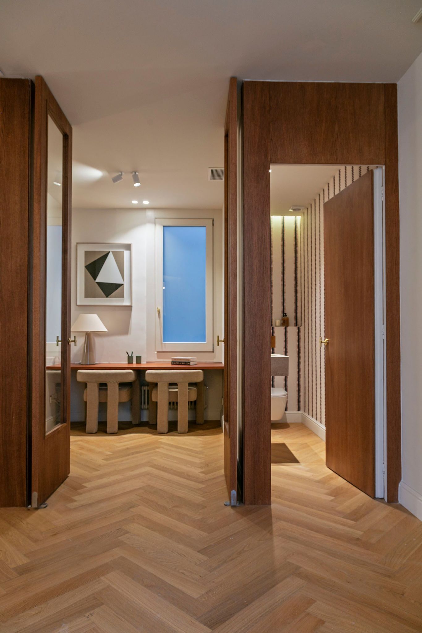 En esta misma zona se encuentra también un despacho independiente con grandes puertas acristaladas de madera, ideal como oficina privada o espacio polivalente.