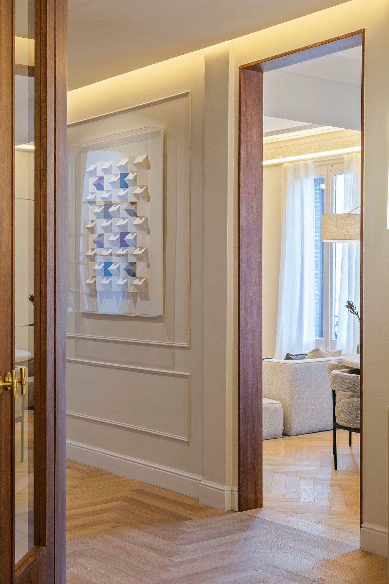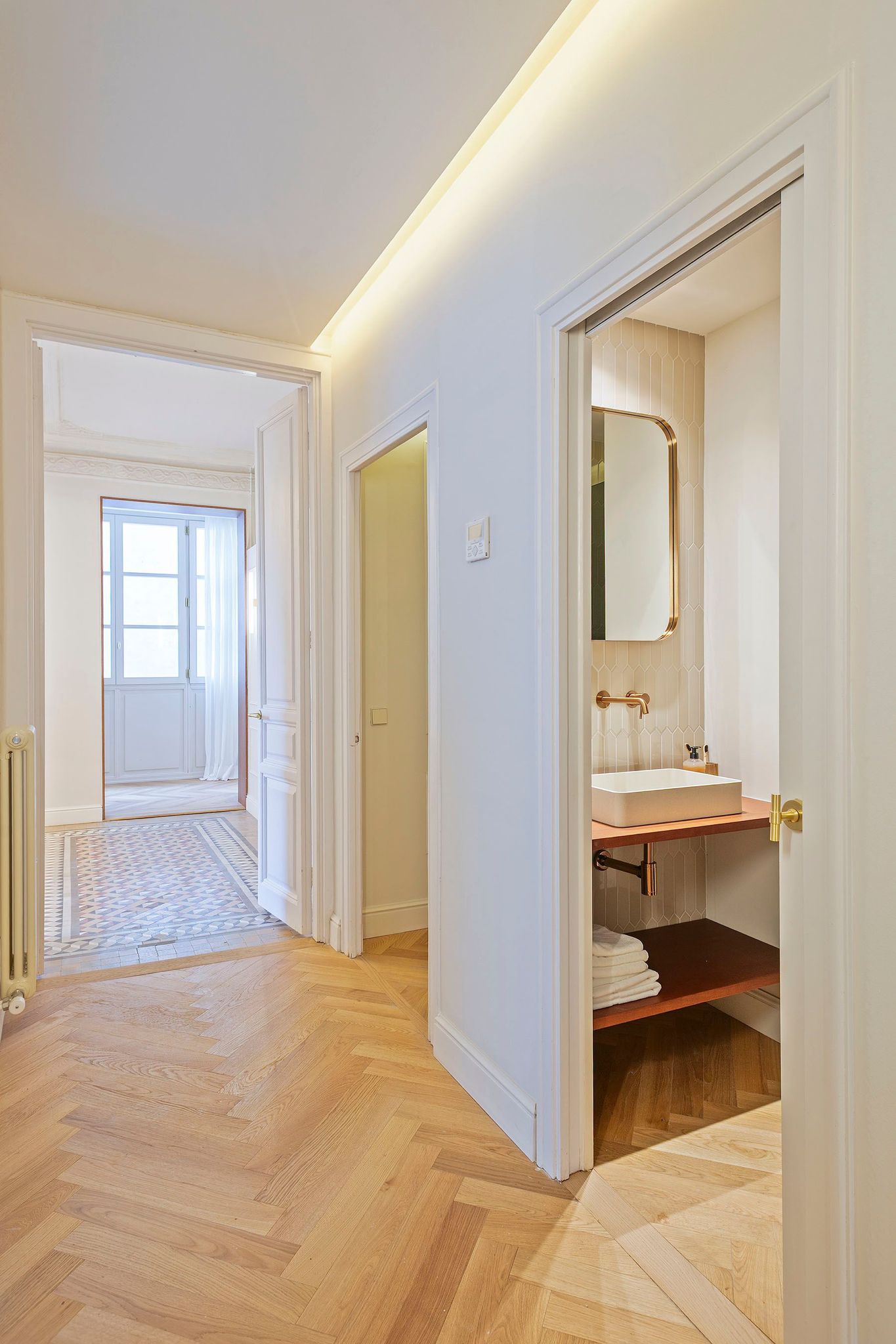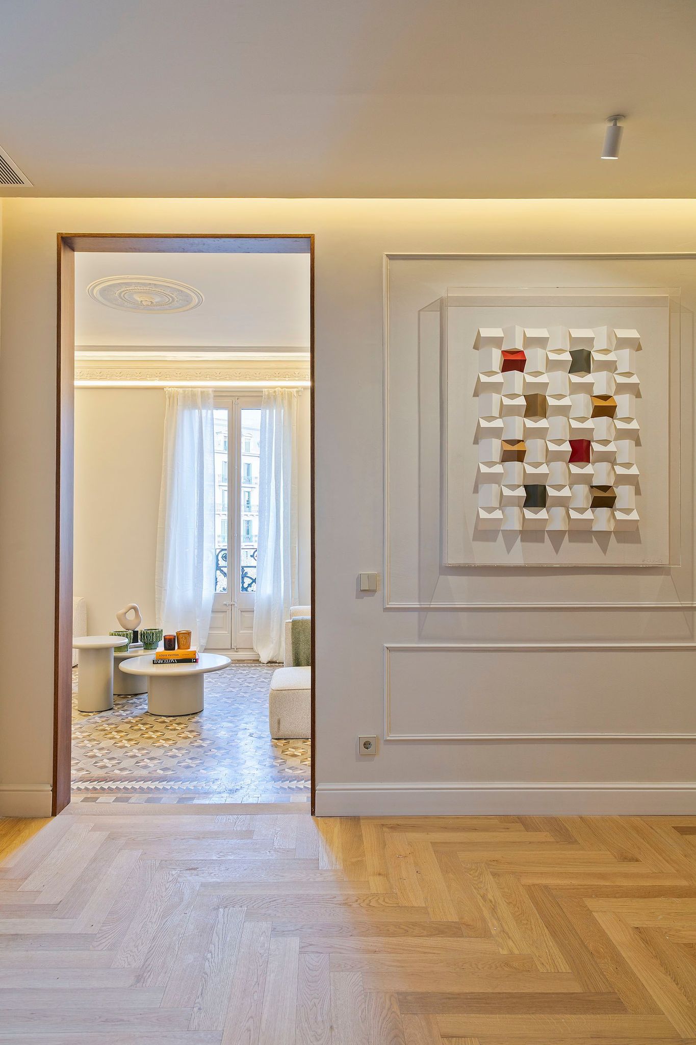 La vivienda conserva y realza numerosos elementos originales de 1900, como los suelos hidráulicos, la cerámica de Nolla y los techos altos con molduras restauradas, integrándolos con materiales nobles y soluciones actuales. Desde la entrada, revestida con paneles de madera natural y detalles clásicos cuidadosamente recuperados, se percibe un estilo sofisticado, cálido y atemporal.