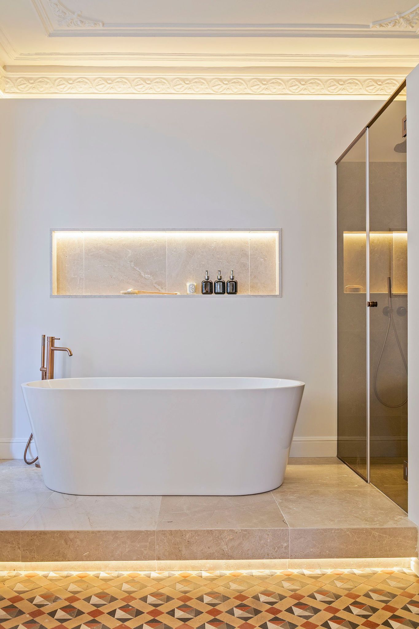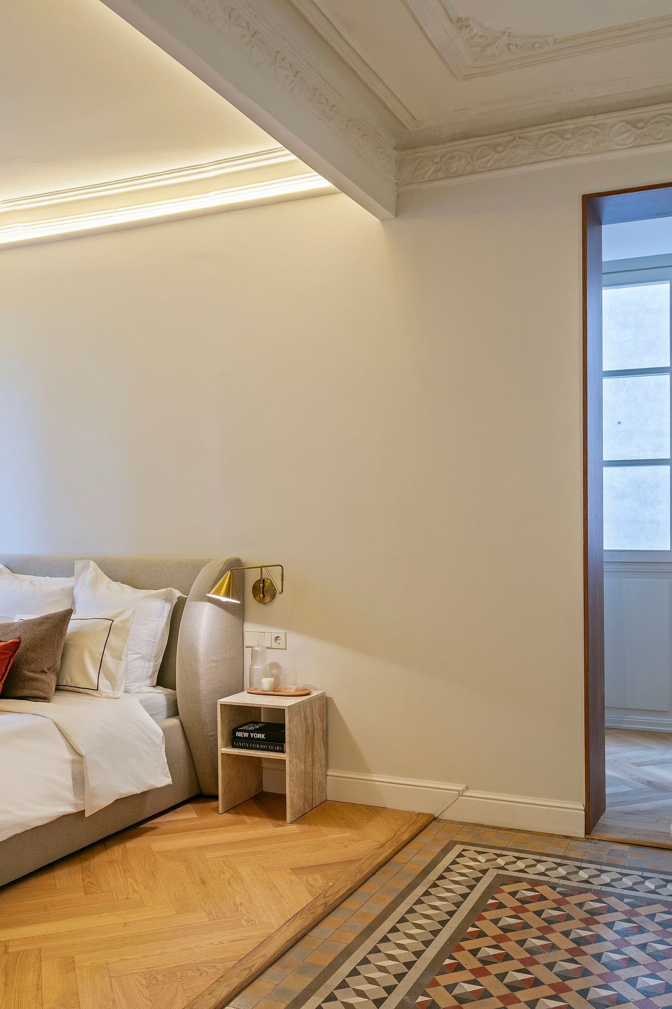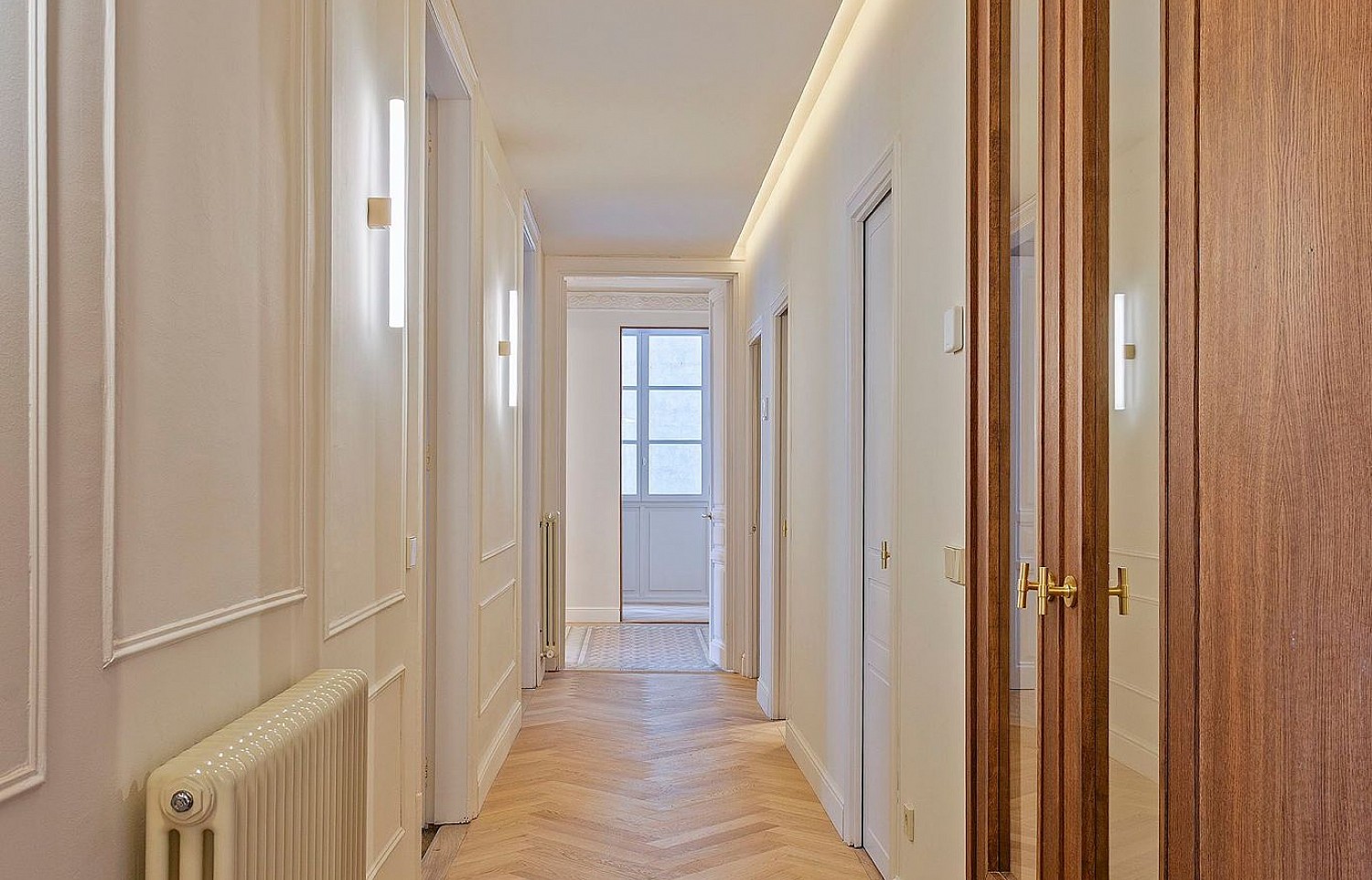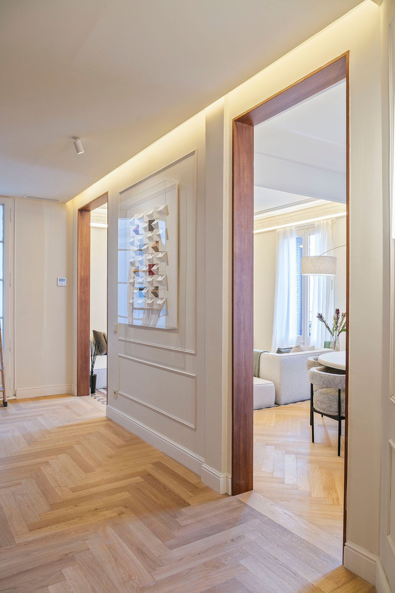 La vivienda conserva y realza numerosos elementos originales de 1900, como los suelos hidráulicos, la cerámica de Nolla y los techos altos con molduras restauradas, integrándolos con materiales nobles y soluciones actuales. Desde la entrada, revestida con paneles de madera natural y detalles clásicos cuidadosamente recuperados, se percibe un estilo sofisticado, cálido y atemporal.