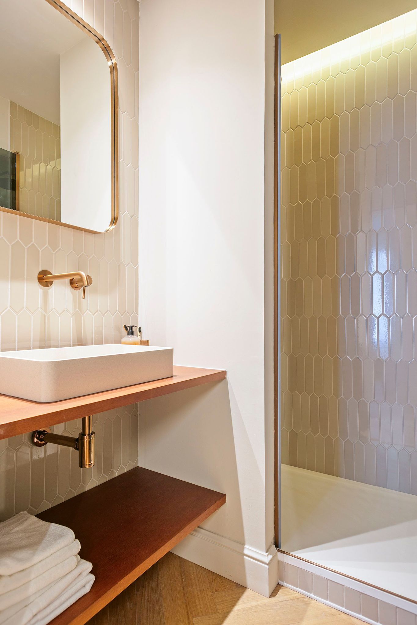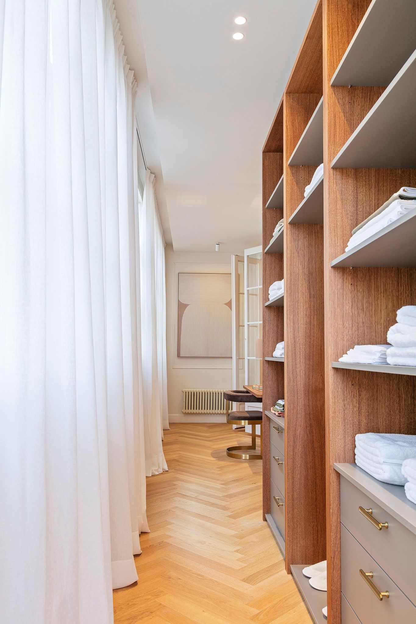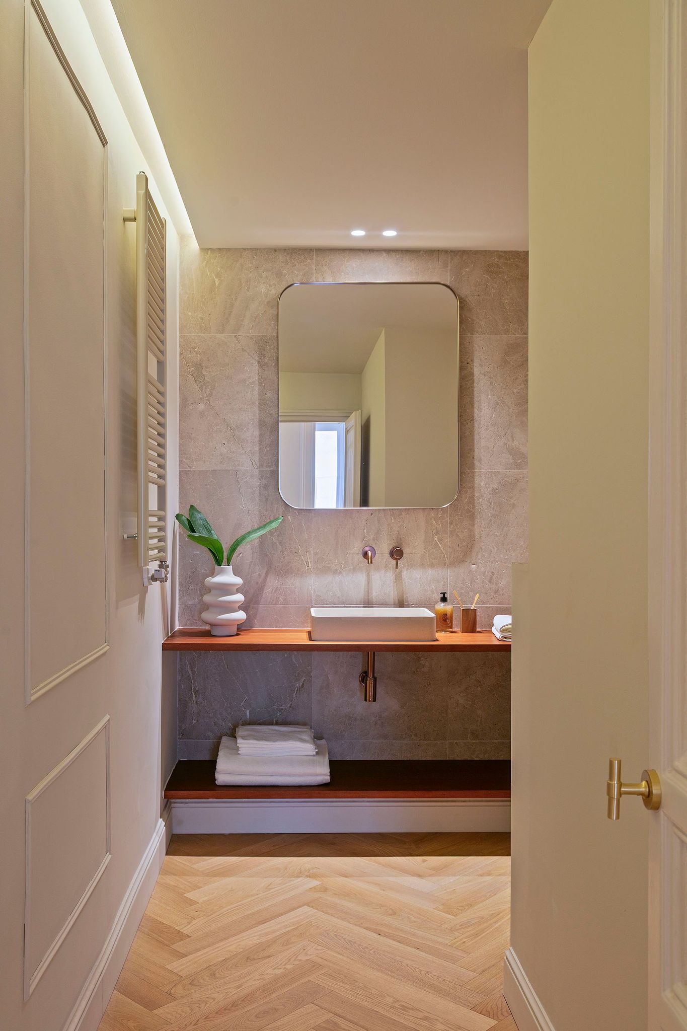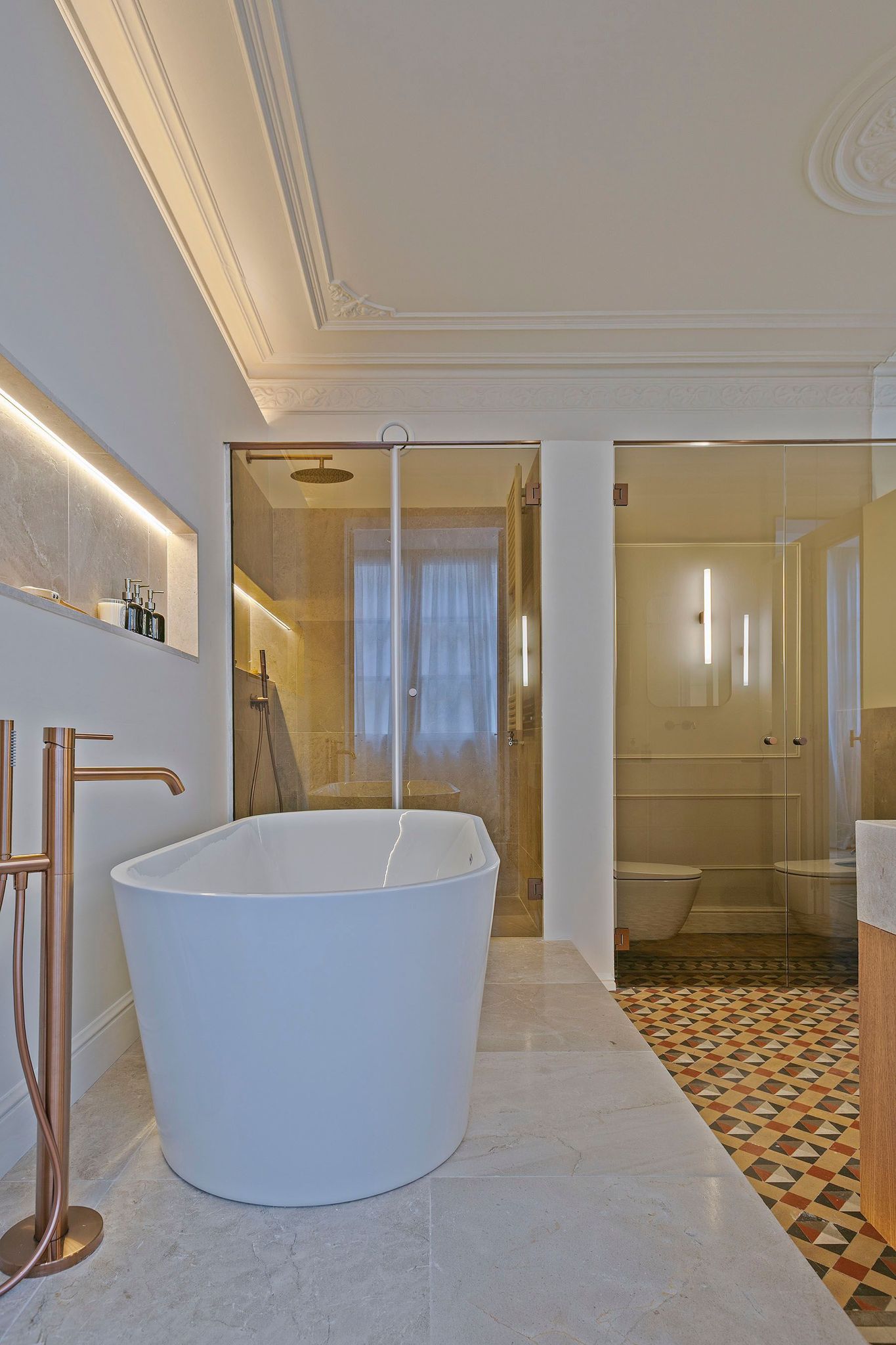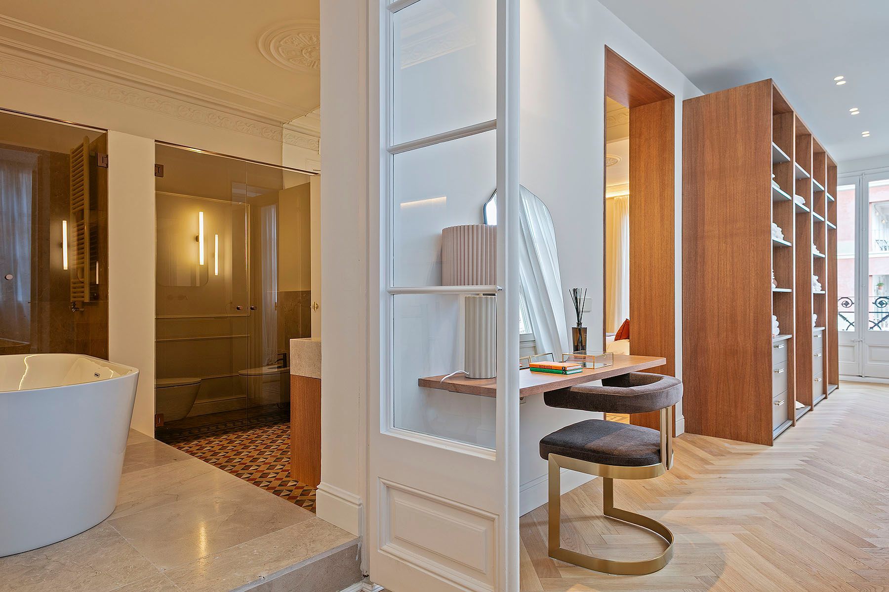 La zona de noche alberga tres amplios dormitorios dobles, todos con baño en suite, armarios empotrados y salida exterior a balcón. La suite principal destaca por su amplitud y luminosidad, incorporando una elegante zona de vestidor y tocador ubicada en la galería original restaurada. El baño principal combina parquet, suelo hidráulico y piedra natural en la zona de aguas, donde se integra una espectacular bañera exenta que convierte el espacio en un auténtico refugio privado.