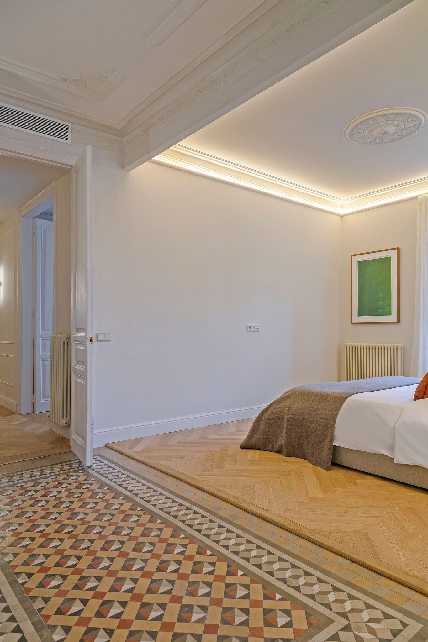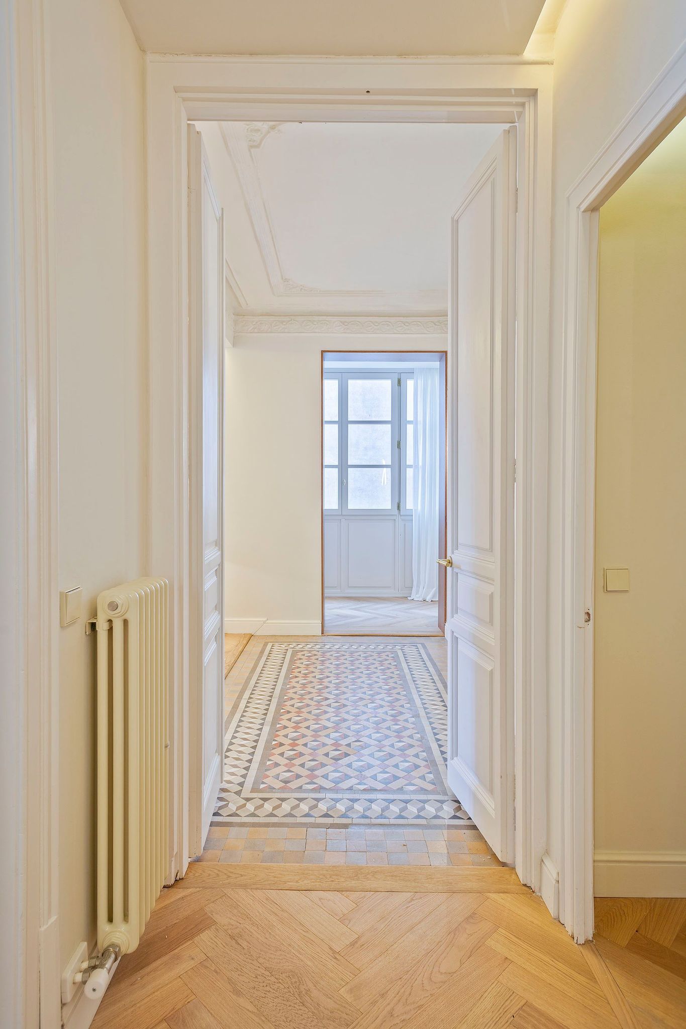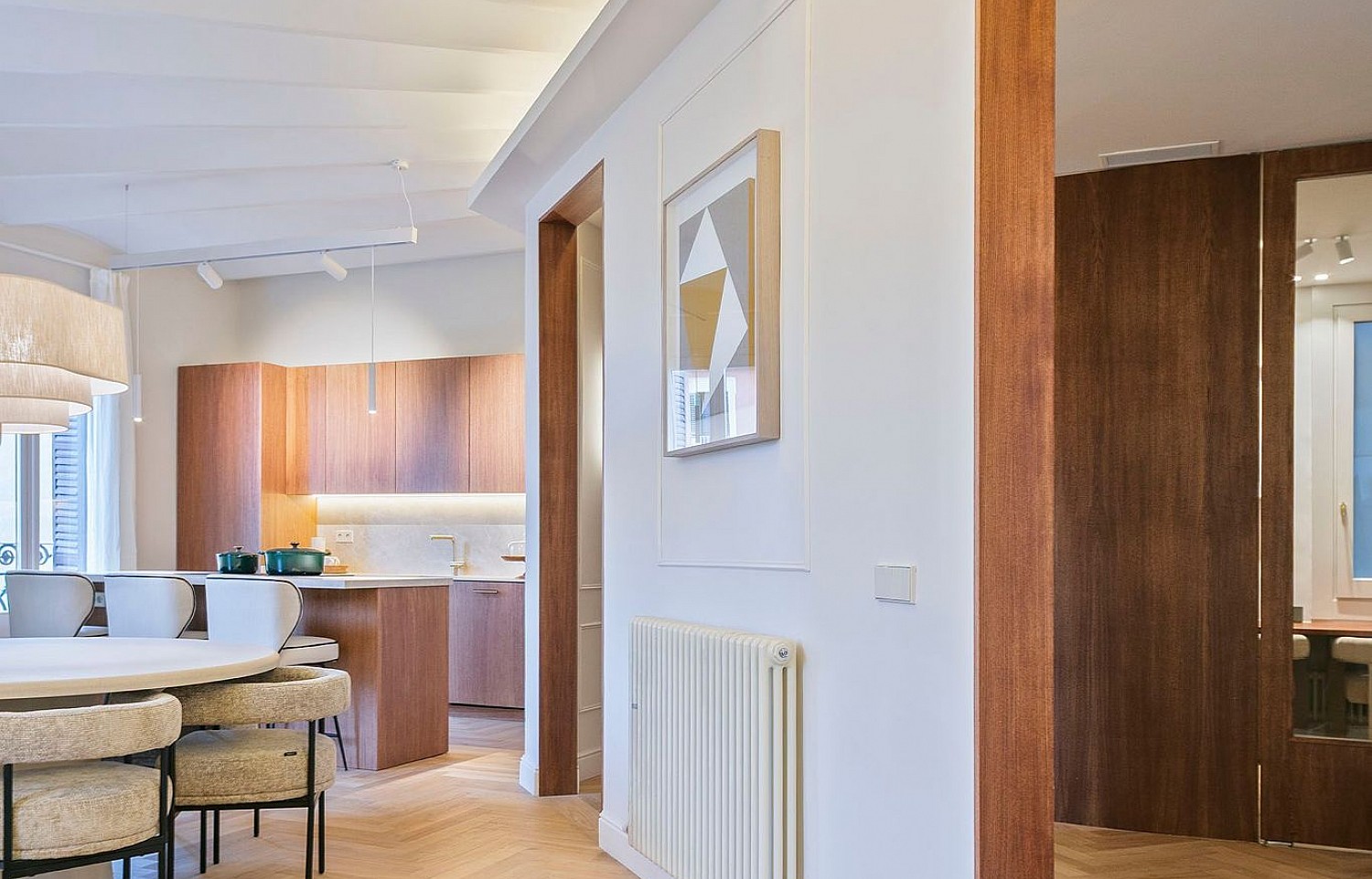 El amplio recibidor distribuye la vivienda en dos zonas claramente diferenciadas. Por un lado, la zona de día, compuesta por un impresionante salón-comedor con cocina integrada, donde se han mantenido los techos originales y parte de los suelos cerámicos históricos, combinados con parquet de roble natural en espiga que aporta confort y elegancia. La cocina, diseñada a medida en madera natural de roble, está equipada con electrodomésticos de alta gama, incluyendo vinoteca de Miele y nevera Studio Line de Siemens, ofreciendo funcionalidad y diseño al más alto nivel.